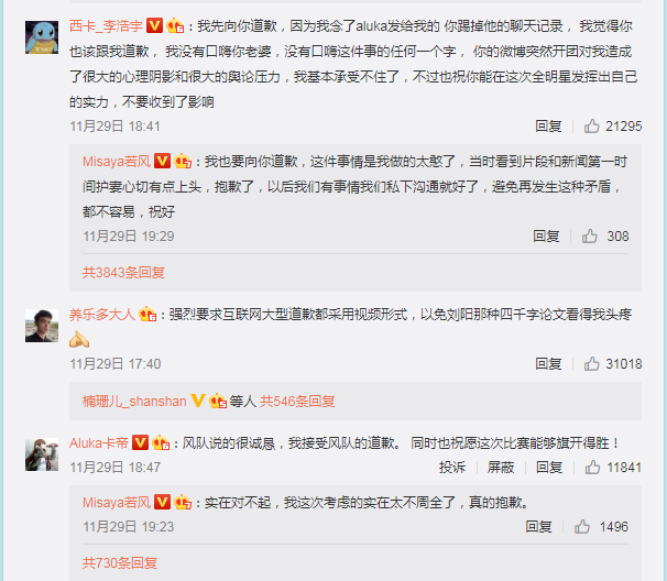 真诚的道歉加上承担责任,这个道歉视频刚出的时候就引发了许多观众的支持,也让不少英雄联盟老粉丝想到当年若风扛起老WE大旗的往事。同时西卡和ALUKA也现身在微博下与若风相互道歉。ALUKA回复:“风队说的很诚恳,我接受风队的道歉,同时也祝愿这次比赛能够旗开得胜!”得到回复的若风也再次文字表示这次的确是自己考虑的不够周全。西卡则对口嗨若风离婚做了解释,若风回复是自己护妻心切,但应该私下解决。
