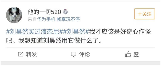 而有的粉丝和网友们都很好奇,刘昊然买“液态屁”是有什么用途?他用它做了什么?