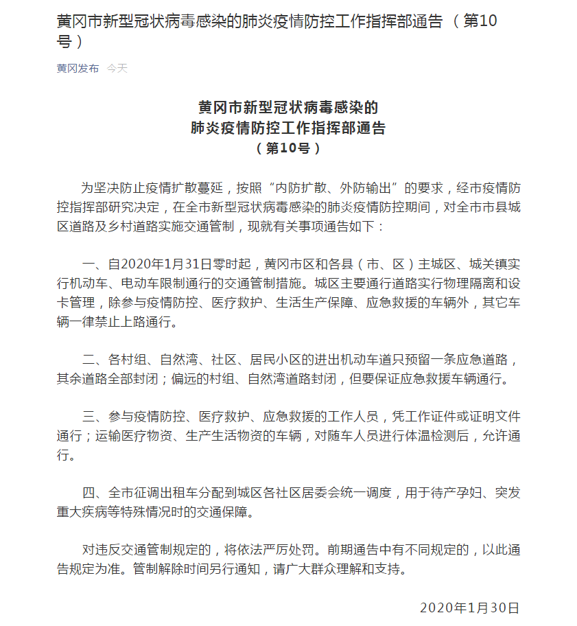 一、自2020年1月31日零时起,黄冈市区和各县(市、区)主城区、城关镇实行机动车、电动车限制通行的交通管制措施。城区主要通行道路实行物理隔离和设卡管理,除参与疫情防控、医疗救护、生活生产保障、应急救援的车辆外,其它车辆一律禁止上路通行。