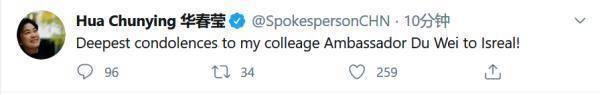中国外交部发言人华春莹在推特上对杜伟大使突然去世表示 " 最深切哀悼 "。华春莹在推特中说," 向我的同事、驻以色列大使杜伟致以最深切哀悼 "。