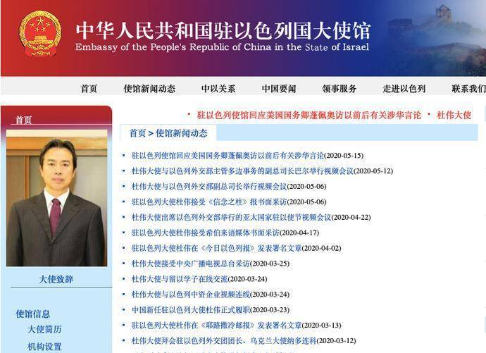 在中国驻以色列大使馆网站的使馆新闻动态中,杜伟最后一次参加的公开活动是在 5 月 12 日,他与以色列外交部主管多边事务的副总司长巴尔举行视频会议,就进一步加强两国在国际多边领域沟通和其他共同关心的问题交换了意见。