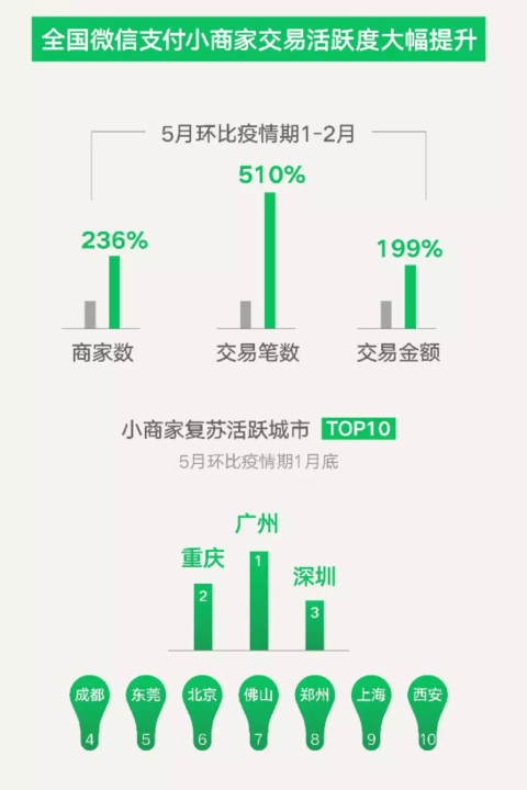 新榜讯 6月8日,微信支付发布最新全国小店经济复苏大数据。数据显示,全国小商家交易活跃度大幅提高,交易总笔数5月环比1-2月增长5.1倍;新增小店主中20-29岁人群增幅最快。