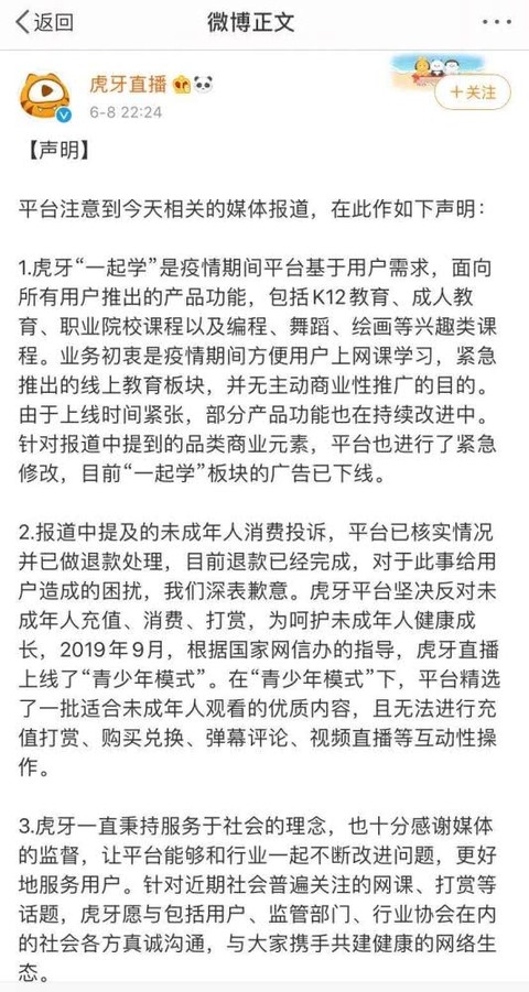 2. 虎牙直播回应被央视点名:未成年人消费投诉已完成退款