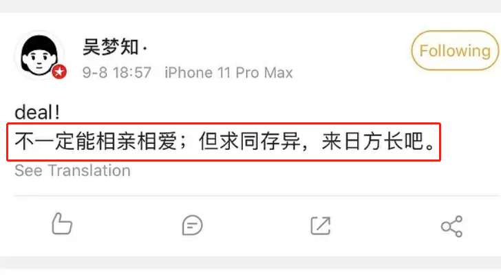 9月8日晚,《浪姐》总导演吴梦知秒删微博,微博的内容是:“不一定能相亲相爱;但求同存异,来日方长吧”。