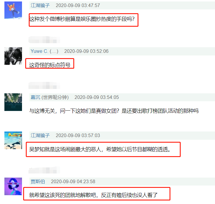在《浪姐》总导演发文秒删之后,网友评论说:“这种发个微博秒删算是娱乐圈炒热度的手段吗?”“这奇怪的标点符号”“吴梦知就是这场闹剧最大的恶人,希望她以后节目都糊得透透”“希望这该死的团就地解散吧,反正后续也没人看了”。