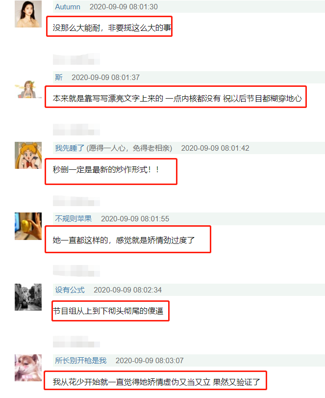 “没那么大能耐,非要揽这么大的事”“本来就是靠写写漂亮文字上来的,一点内核都没有,祝以后节目都糊穿地心”“秒删一定是最新的炒作形式”“她一直都这样的,感觉就是矫情劲过度了”“我从花少开始就一直觉得她矫情虚伪又当又立,果然又验证了”。