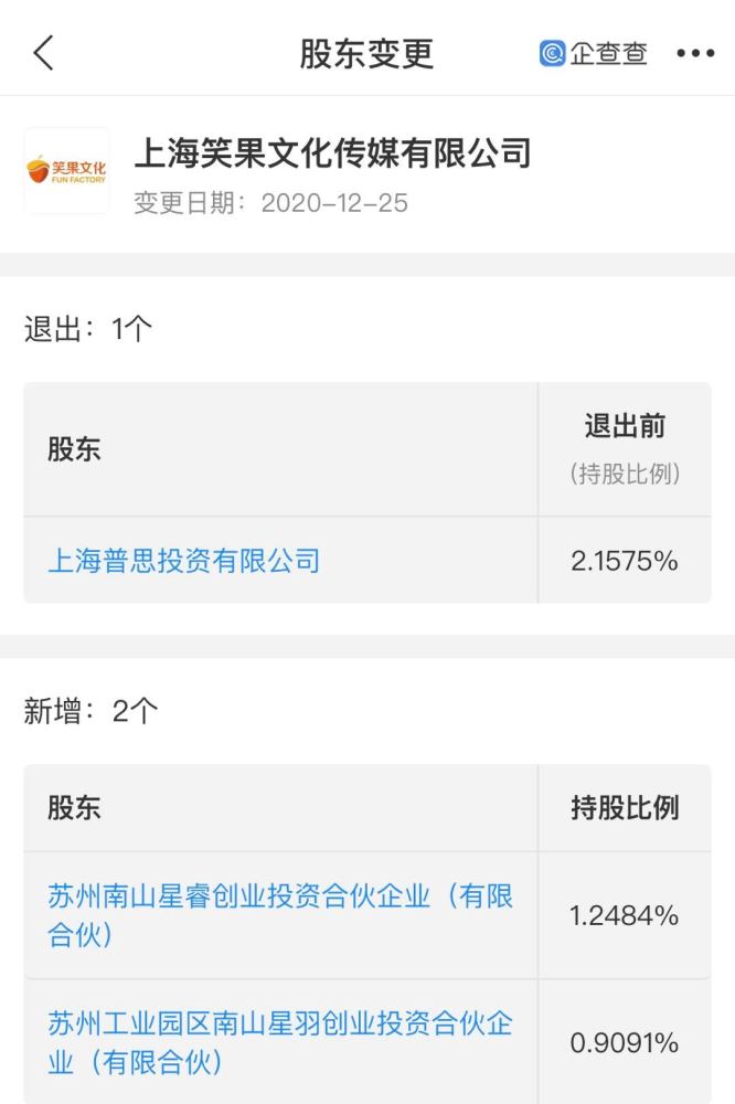 笑果文化公司的信息页面上,除了王思聪撤出股东外,还有另外两家公司分加入了进来,分别是苏州南山星睿创业投资合伙企业和苏州工业园区南山星羽创业投资合伙企业。