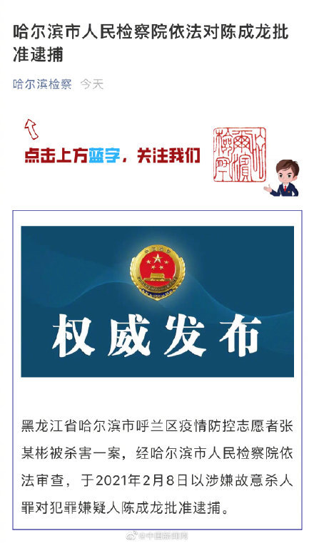 【杀害哈尔滨防疫志愿者凶手被批捕】据“哈尔滨检察”微信公众号消息,黑龙江省哈尔滨市呼兰区疫情防控志愿者张某彬被杀害一案,经哈尔滨市人民检察院依法审查,于2021年2月8日以涉嫌故意杀人罪对犯罪嫌疑人陈成龙批准逮捕。据警方此前通报,2月3日12时40分许,张某彬(男,社区志愿者)在呼兰区康金镇康乐小区门前管理人员进出时,被该小区居民陈某龙(男)持刀捅伤,张某彬经送医抢救无效死亡。