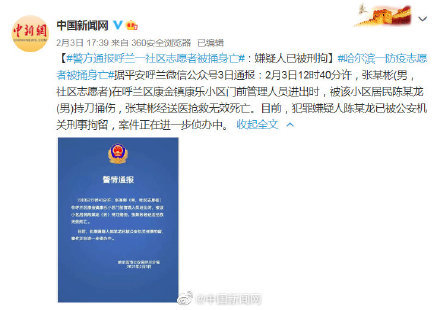 杀害哈尔滨防疫志愿者凶手被批捕