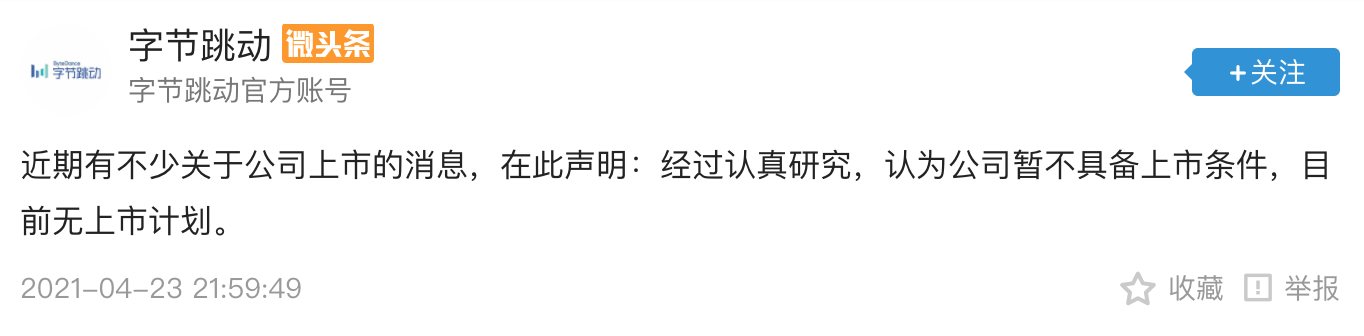 4月23日晚间,字节跳动发布消息称,近期有不少关于公司上市的消息,在此声明:经过认真研究,认为公司暂不具备上市条件,目前无上市计划。